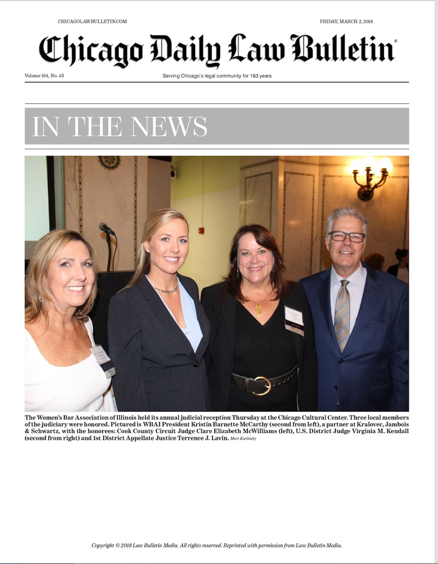 The Women’s Bar Association of Illinois held its annual judicial reception where three local members of the judiciary were honored. Pictured is WBAI President Kristin Barnette McCarthy (second from left), and partner at Schwartz Jambois, with the honorees: Cook County Circuit Judge Clare Elizabeth McWilliams (left), U.S. District Judge Virginia M. Kendall (second from right) and 1st District Appellate Justice Terrence J. Lavin.